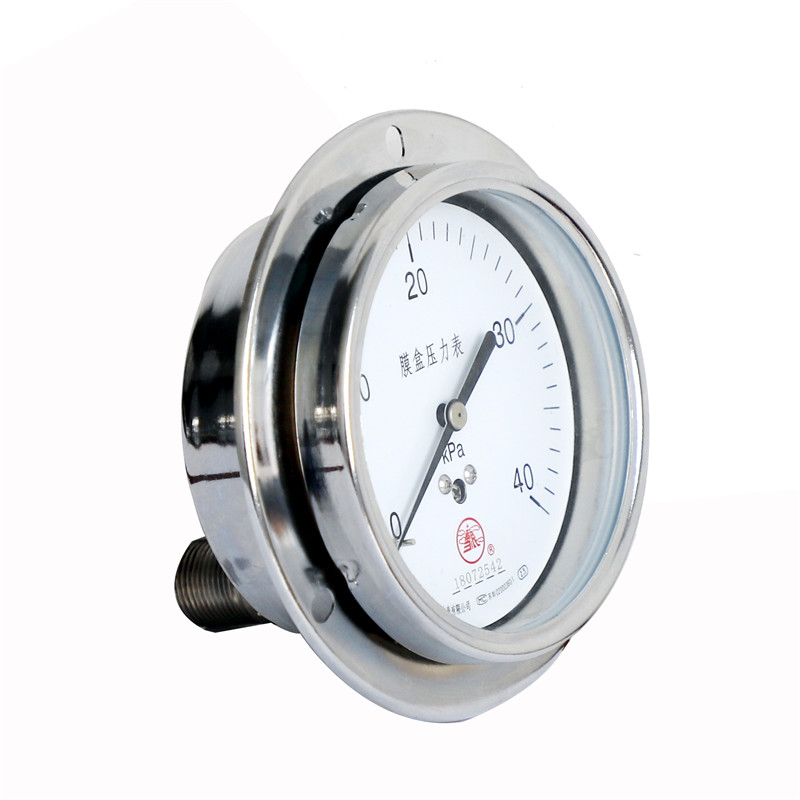 不銹鋼膜盒壓力表采用不銹鋼波紋膜盒作為測(cè)量微小壓力的敏感元件。不銹鋼膜盒壓力表適用于測(cè)量對(duì)不銹鋼不起腐蝕作用,無(wú)爆炸危險(xiǎn)的氣體或液體的微小壓力。表盤上面有調(diào)零裝置,可以方便調(diào)整零位。不銹鋼膜盒壓力表廣泛應(yīng)用于石油、化工、冶金等工業(yè)部門壓力測(cè)量,不銹鋼膜盒壓力表可以就地安裝并現(xiàn)場(chǎng)指示壓力。